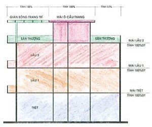 Từ hai cách tính này ta có thể rút ra: cứ tạo được bao nhiêu không gian sử dụng thì tính bấy nhiêu diện tích cộng lại – nhà 1 trệt, 2 lầu là 3 không gian sử dụng.