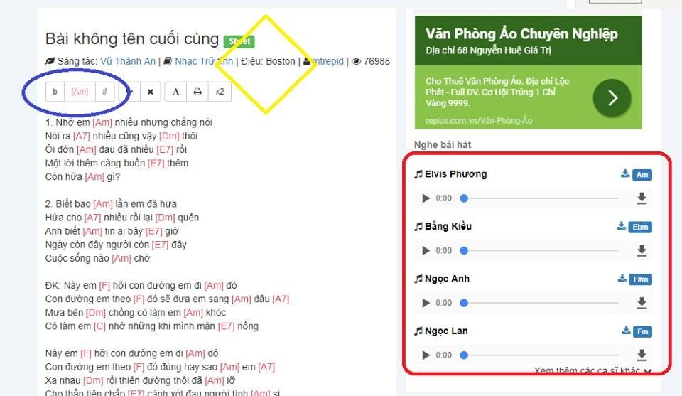 - Ở bên phải có list các bài hát do các ca sỹ hát (khung vuông đỏ), có kèm giọng (VD: Am (la thứ), Fm, Ebm ...). Bạn nghe, hát theo, xem hợp với giọng nào.