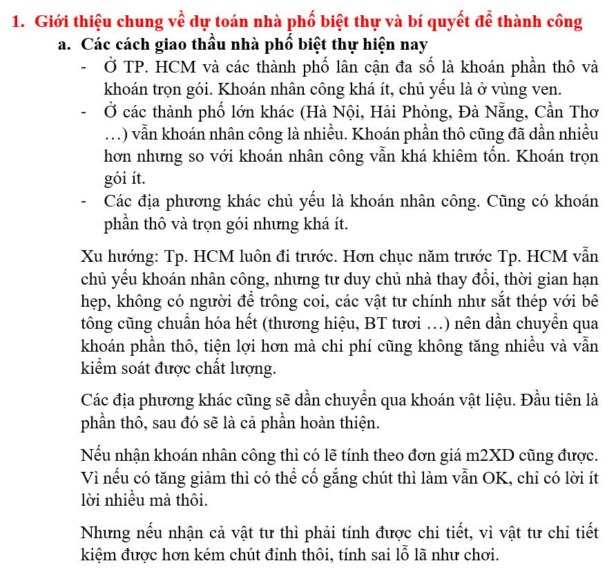Trước kia, thị trường nhà dân chủ yếu tính theo đơn giá m2XD. Đó là do thời xa xưa, Thầu cũng chỉ là các bác đi lên từ thợ từ cai nên chỉ tính được m2XD chứ không thể tính được chi tiết. Chủ nhà thì càng mơ hồ, chỉ biết nhẩm m2XD thôi chứ đọc cái dự toán chi tiết cũng rối một nùi. Thời đó chủ yếu khoán nhân công, nên tính m2XD cũng vẫn hợp lý, vì công trình đơn giản, lỡ có sai thì cũng chịu khó thúc anh em làm thêm giờ bù lại.