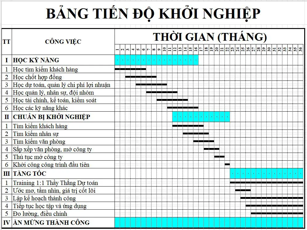 Khi đã ấn định được thời gian, hãy lên kế hoạch về việc học tập, chuẩn bị tài chính, nhân sự, văn phòng, tìm kiếm những khách hàng đầu tiên, các công trình đầu tiên ... cho một sự khởi động thuận lợi và thành công.
