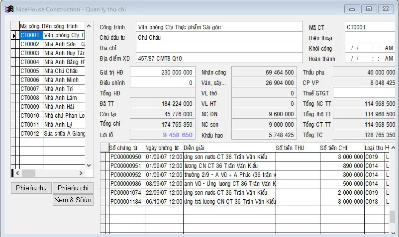 Chuẩn bị cho khóa học "Ghi chép và hạch toán chi phí công trình trên Excel", mình lục lại cái phần mềm lúc trước mình tự viết để quản lý chi phí khi thi công năm 2006-2008 với thương hiệu NiceHouse - Ngôi nhà hàng hiệu.