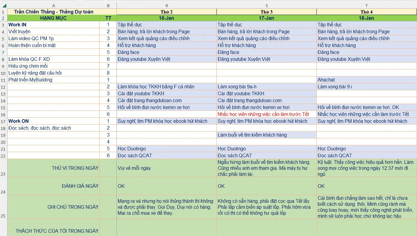 Thủ tục bắt buộc trước khi đi ngủ. Review lại công việc hàng ngày. Việc nào chưa hoàn thành bắt buộc phải làm xong rồi mới đi ngủ.