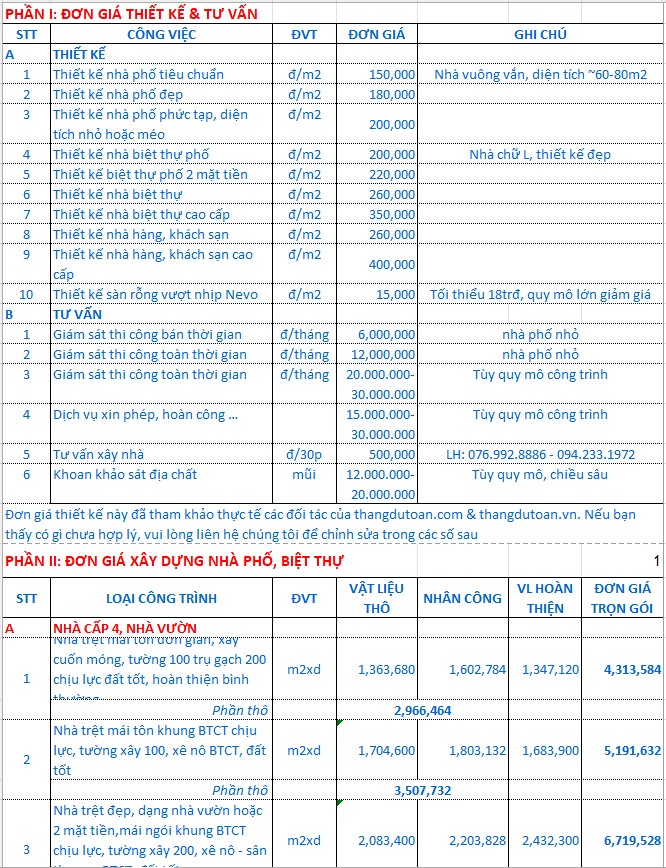 Bảng giá đã được cập nhật giá tháng 2/2023, gồm giá thiết kế, đơn giá m2XD, cách tính m2XD (hệ số theo kiểu Tp. HCM), đơn giá khái toán nhà xưởng VP, giá vật tư nhân công, đơn giá công việc.