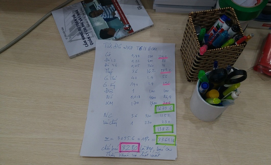 2. Công cụ truyền thống: Giấy và viết : Trường hợp xài cùi bắp, thì có thể xài công cụ truyền thống vậy. Các bạn lấy số liệu hao phí về vật tư nhân công theo bảng dưới đây rồi áp giá thực tế, nhân chia bằng tay vậy.