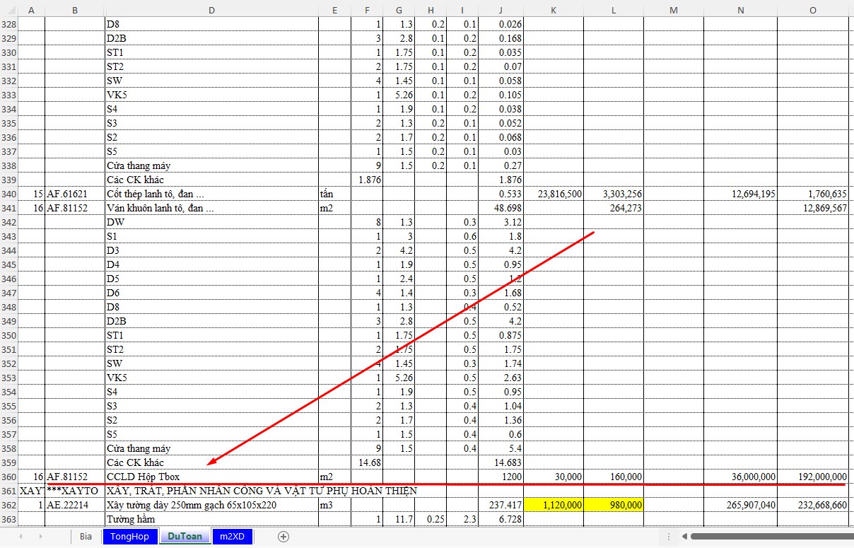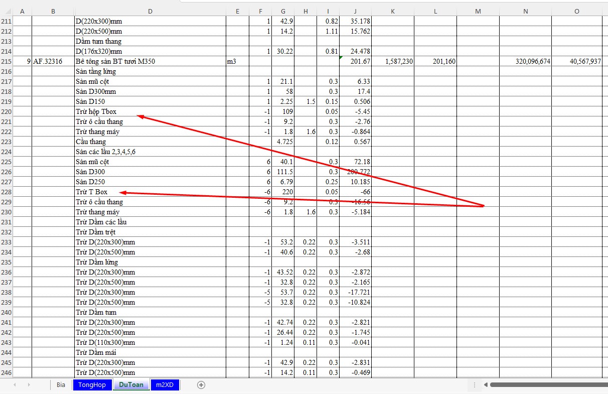 Thực ra việc tính sàn hộp cũng khá đơn giản. Chỉ cần thêm một dòng hộp làm sàn, tính theo m2 (cũng có thể quy theo hộp cũng được). Còn khối lượng ván khuôn, bê tông, cốt thép thì tính bình thường.