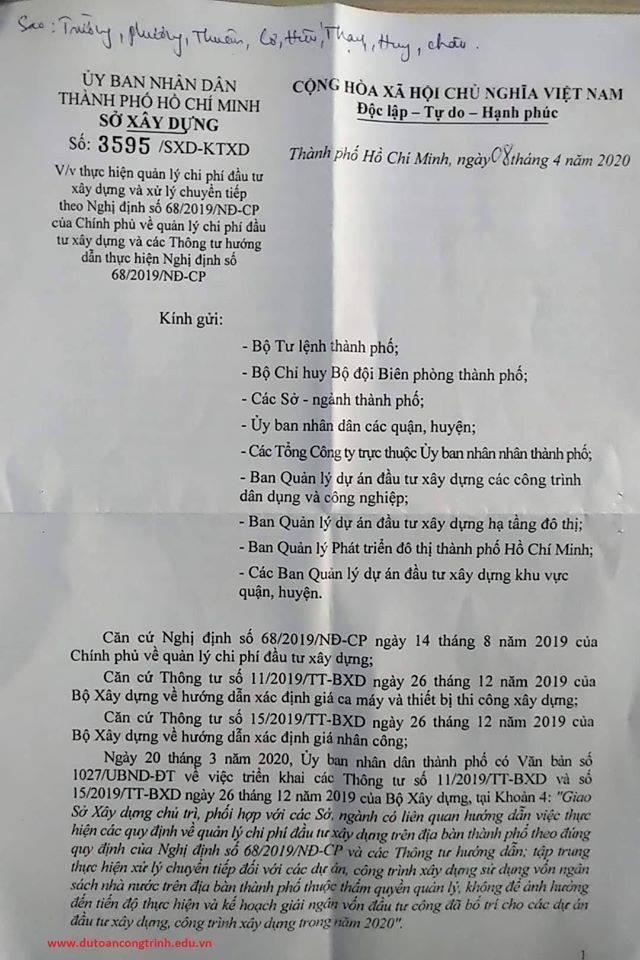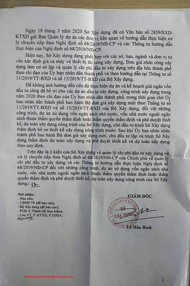 Công văn hướng dẫn của Sở Xây dựng về việc lập dự toán theo quy định mới nhất 2020
