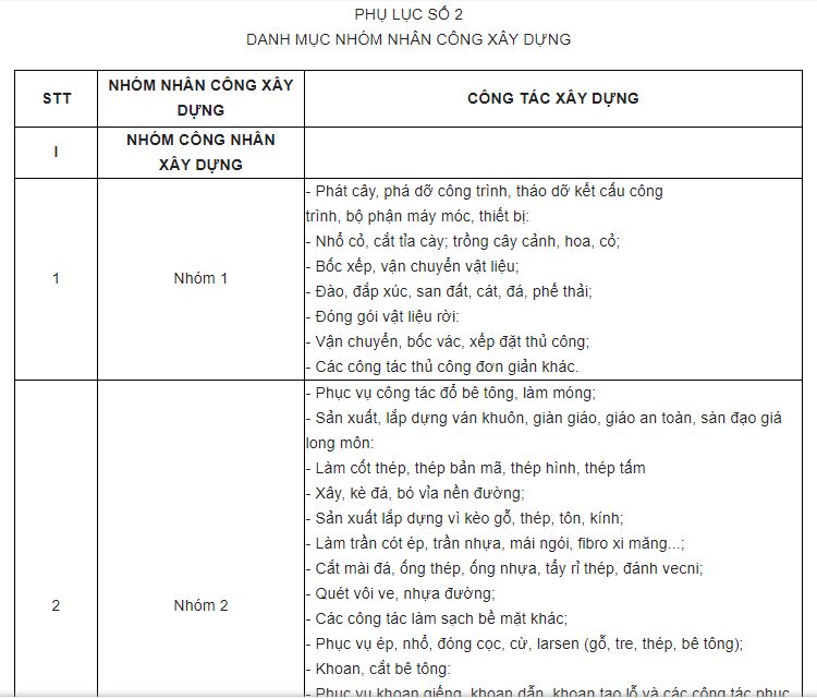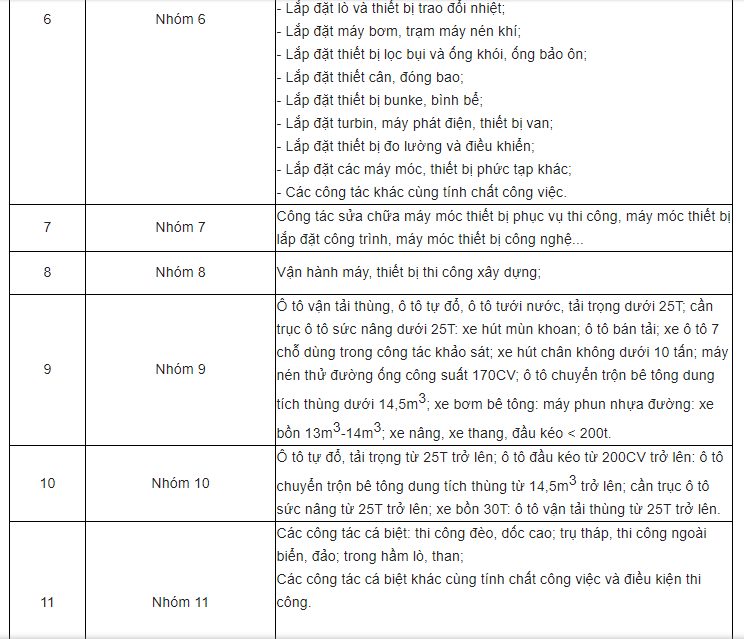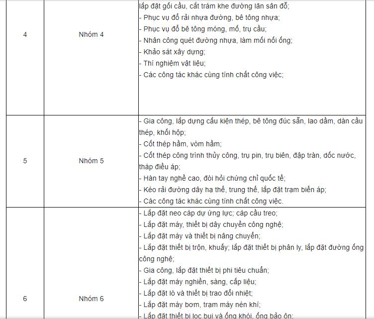 Quy định về nhóm nhân công thay đổi nhiều rồi nhé các bạn. Hiện có tới 11 nhóm nhân công nhé các bạn (xem hình).