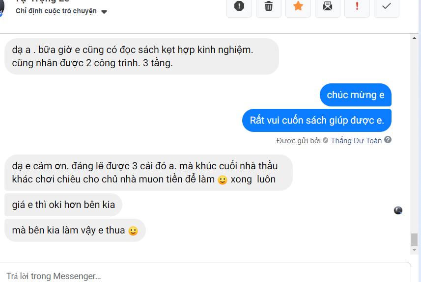 Rất nhiều anh em phản hồi nhờ cuốn sách "5 cách tính đơn giá m2XD và dự toán chi phí xây nhà đơn giản dễ thực hiện" mà họ đã nhận được thêm công trình với giá tốt và thi công có lợi nhuận.