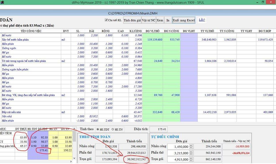 Khối lượng thì dtPro MyHouse tính hoàn toàn tự động, nên ít khi sai lắm. Trừ trường hợp người dùng nhập sai (khá hiếm) hoặc tự nhập chi tiết sai (cũng có xảy ra, tôi đã có bài về trường hợp này)