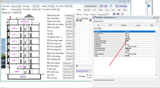 3. Tăng giới hạn nhập vào các ô: Lúc trước tôi giới hạn nhập vào các ô, sợ các bạn nhập sai. VD: chiều dài giới hạn 60m (với nhà dân là quá dài rồi), diện tích 300m2. Nhưng nhiều bạn làm các công trình lớn hơn (nhà cho thuê, văn phòng ...) nhập không được.