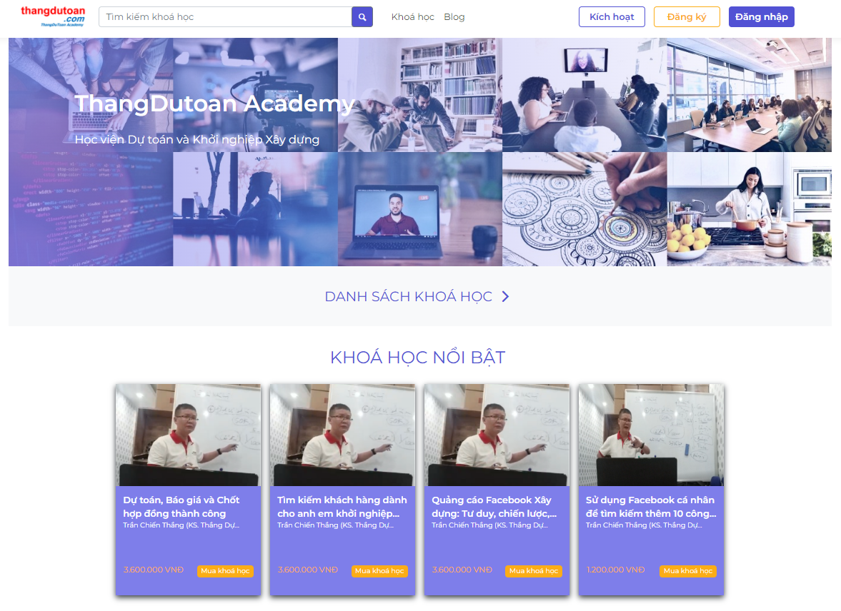 Chúng tôi mới phát triển thêm trang thangdutoan.com chuyên về các khóa học (tương tự như unica, kyna ...), bên cạnh thangdutoan.vn là trang chuyên chia sẻ các kiến thức kinh nghiệm video bài giảng. Bao gồm các khóa học về dự toán, tìm kiếm khách hàng xây dựng, làm việc và chốt hợp đồng, quảng cáo facebook xây dựng ...