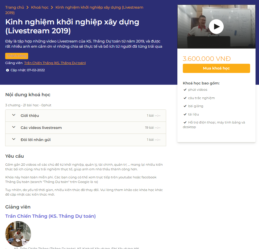 Khóa học này bán với giá 3.600.000đ, nhưng bạn có thể xem trước toàn bộ hoàn toàn miễn phí. Các bạn có thể xem trực tiếp các video trên youtube hoặc facebook Thắng Dự toán (Search "Thắng Dự toán" trên Google là có). Hoặc cũng có thể xem trên trang thangdutoan.vn