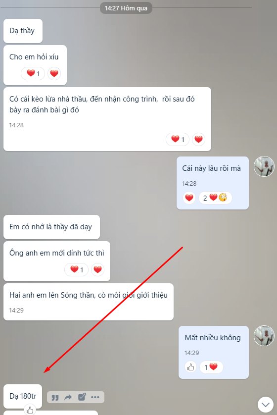 - Mồi nhử là dự án, công trình, người anh người chú bên Mỹ về xây nhà, bà cô bà chị xây nhà ... tóm lại là mồi rất thơm.