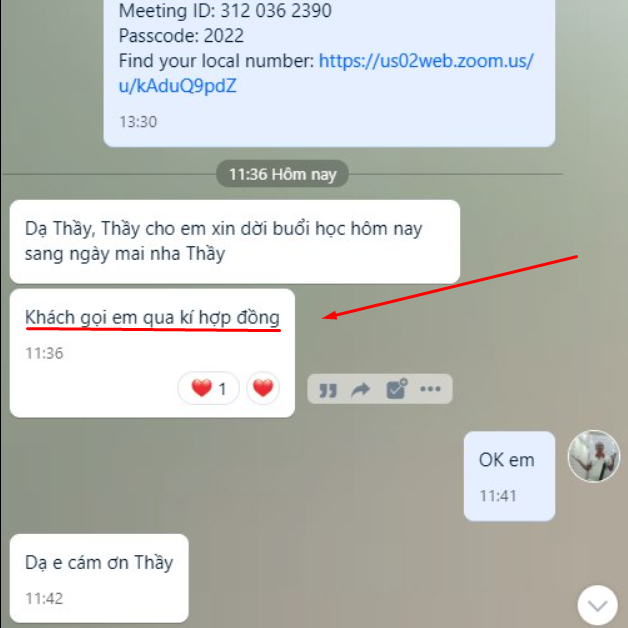 Tin nhắn từ một bạn tham gia "Nắm tay nhau tới thành công" với mình. Mình yêu cầu nếu dời lịch học thì phải báo trước 24h. Thấy nhắn tin dời lịch trước có 1h, tính cự.