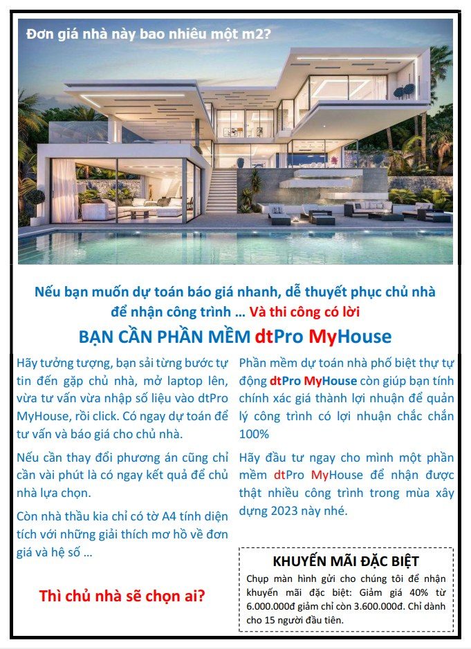 Đầu tư ngay cho mình một phần mềm dự toán nhà phố biệt thự tự động dtPro MyHouse nhé. Đang có khuyến mãi đặc biệt đấy.
