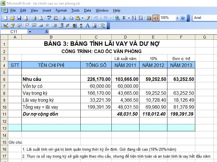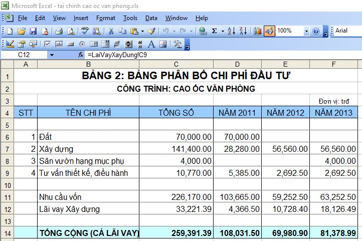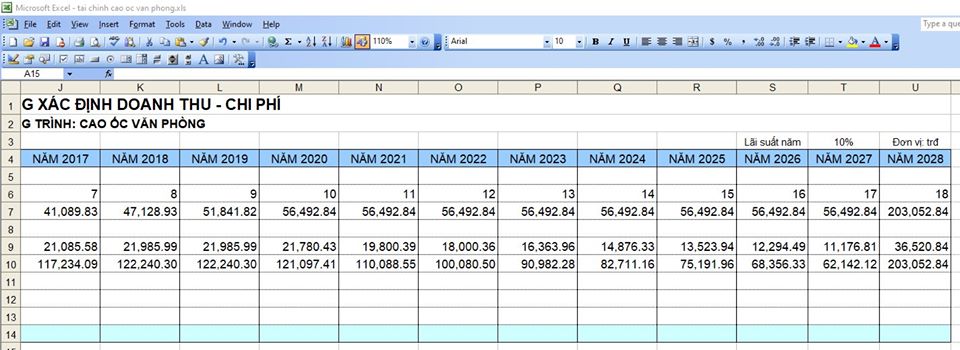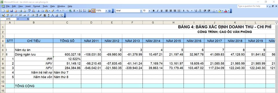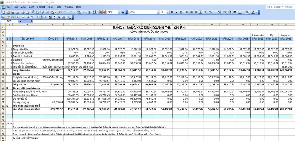 Cái này là phân tích tài chính để xây dựng cao ốc văn phòng cho thuê. Vì dậy cho mấy em Cao Đẳng nên mình phải soạn lại cho thật đơn giản, những cái thuế má khấu hao mình đưa hết vào dạng những thứ thông thường mọi người đều có thể hiểu được. (chứ mà nói theo kiểu tài chính NỢ CÓ rồi chi phí khấu hao nhưng tiền lại thu về thì khéo cả năm không xong, mà chương trình có 30 tiết).