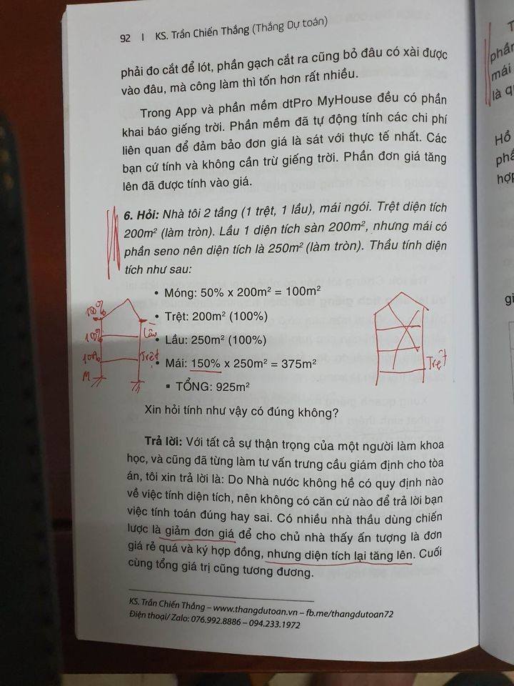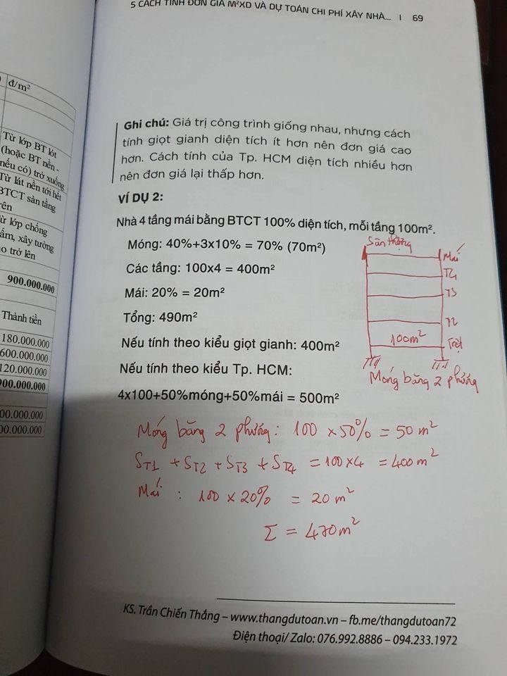 Hình chụp một độc giả kỹ tính ghi chép kiểm chứng khi đọc cuốn sách "5 cách tính đơn giá m2XD và dự toán chi phí xây nhà", NXB Lao Động của KS. Trần Chiến Thắng (Thắng Dự toán)