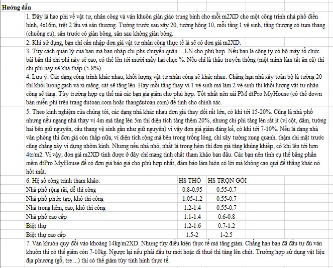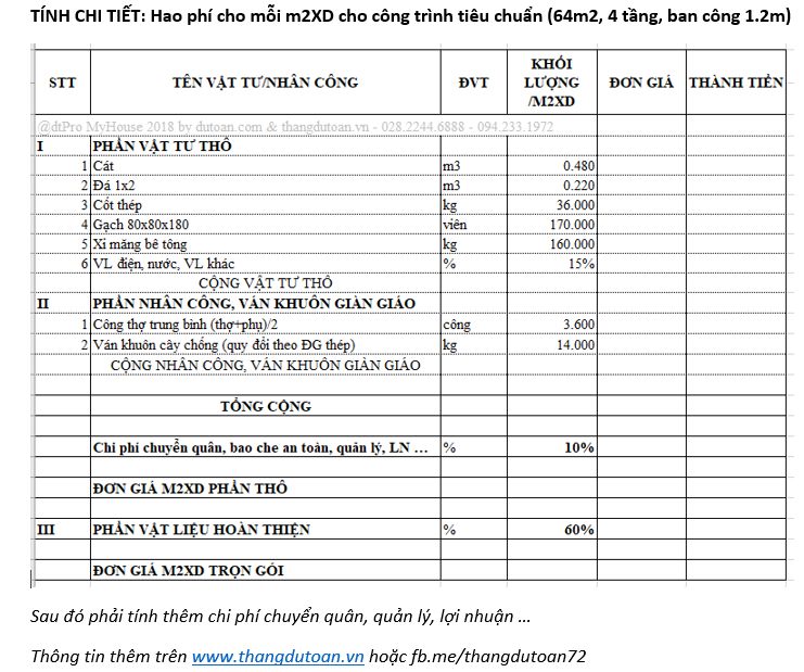 Chúng tôi đã tổng kết theo kinh nghiệm hàng ngàn dự toán đã làm, và tính được khối lượng xi măng, gạch, thép, nhân công ... hao phí cho mỗi m2XD. Các bạn chỉ cần áp giá là tính được đơn giá m2XD.