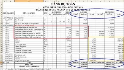 Trong hình, đơn giá và thành tiền tách ra phần vật liệu thô, nhân công, vật liệu hoàn thiện.