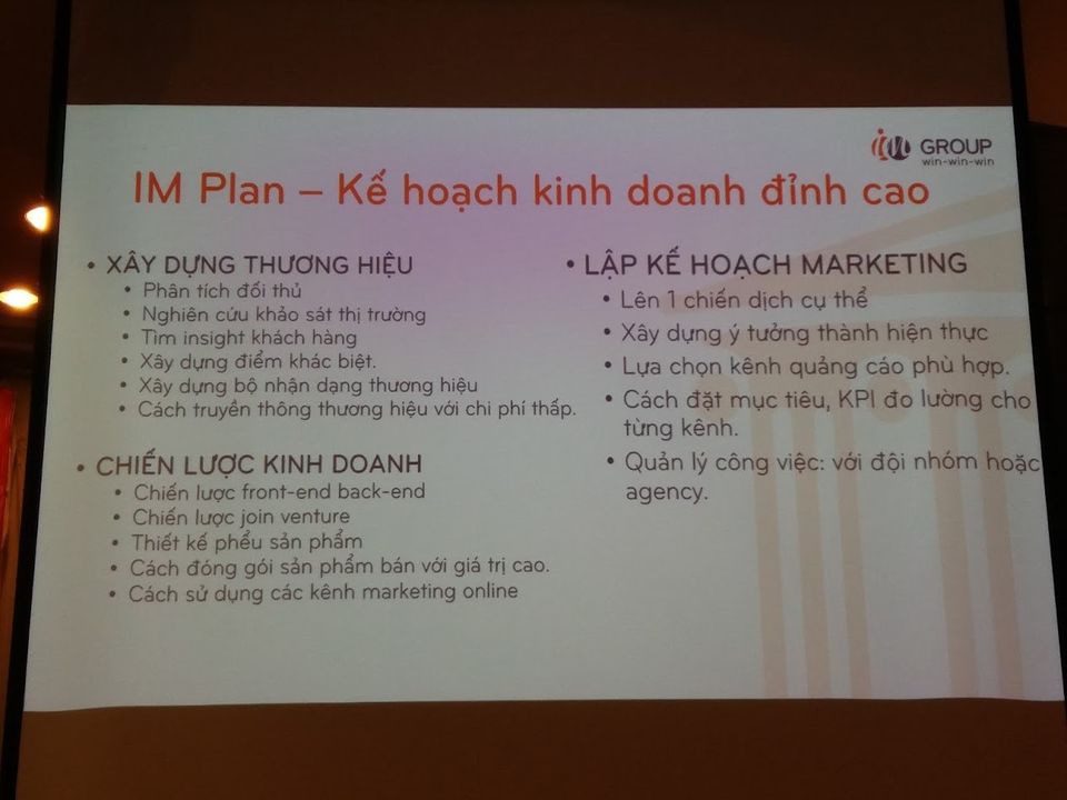 - Khóa IM Plan, kiến thức chung về việc xây dựng thương hiệu và dùng Web, face ... để tạo dựng thương hiệu.