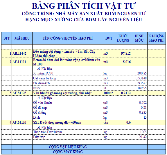 Bạn lấy khối lượng công việc, nhân với định mức để được khối lượng vật tư hao phí.