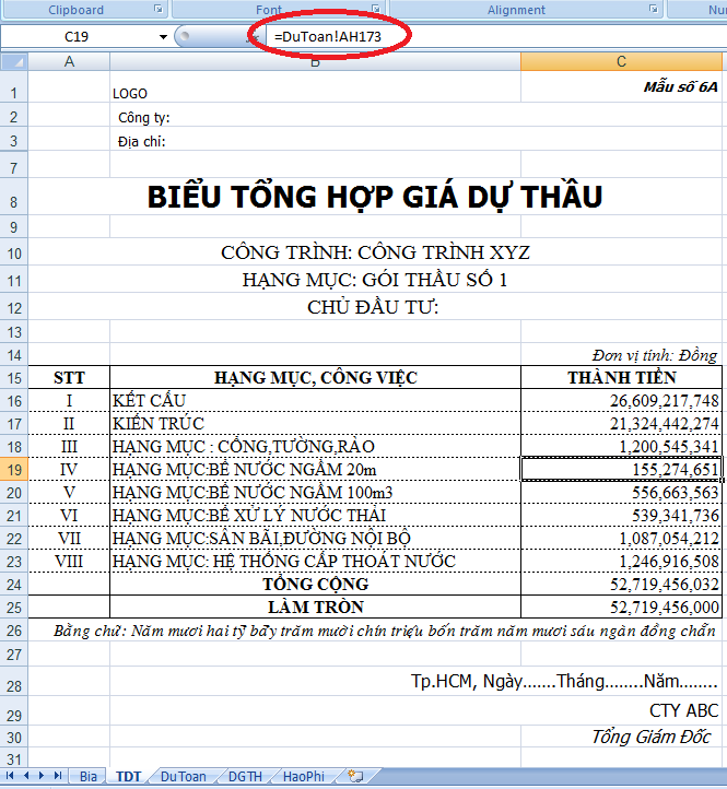 - Biểu tổng hợp giá dự thầu (mẫu 8A): Phải làm thêm bảng này. Bảng này chỉ là một Sheet Excel bình thường rồi link tổng các hạng mục từ Sheet DuToan (mẫu 8B) sang.
