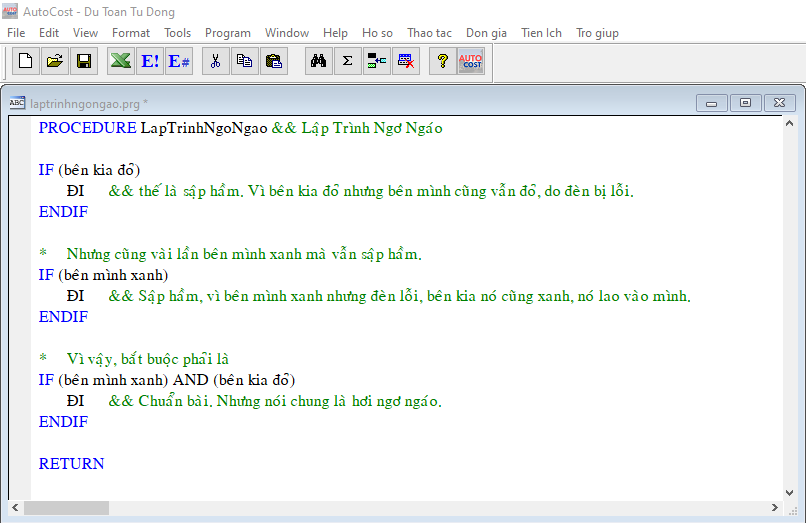 Không biết những thằng lập trình viên khác thì sao, chứ tôi thì cách làm việc máy móc ăn sâu vào đầu óc. Người bình thường dừng đèn đỏ, phía bên kia đỏ là kéo ga chạy. Nhưng bọn coder thì không. Phải coi đúng đèn bên mình xanh thì mới chạy. Vì lỡ rờ le hỏng. Bên kia nó đỏ nhưng bên mình chưa kịp xanh, chạy lỡ ăn phạt thì sao?