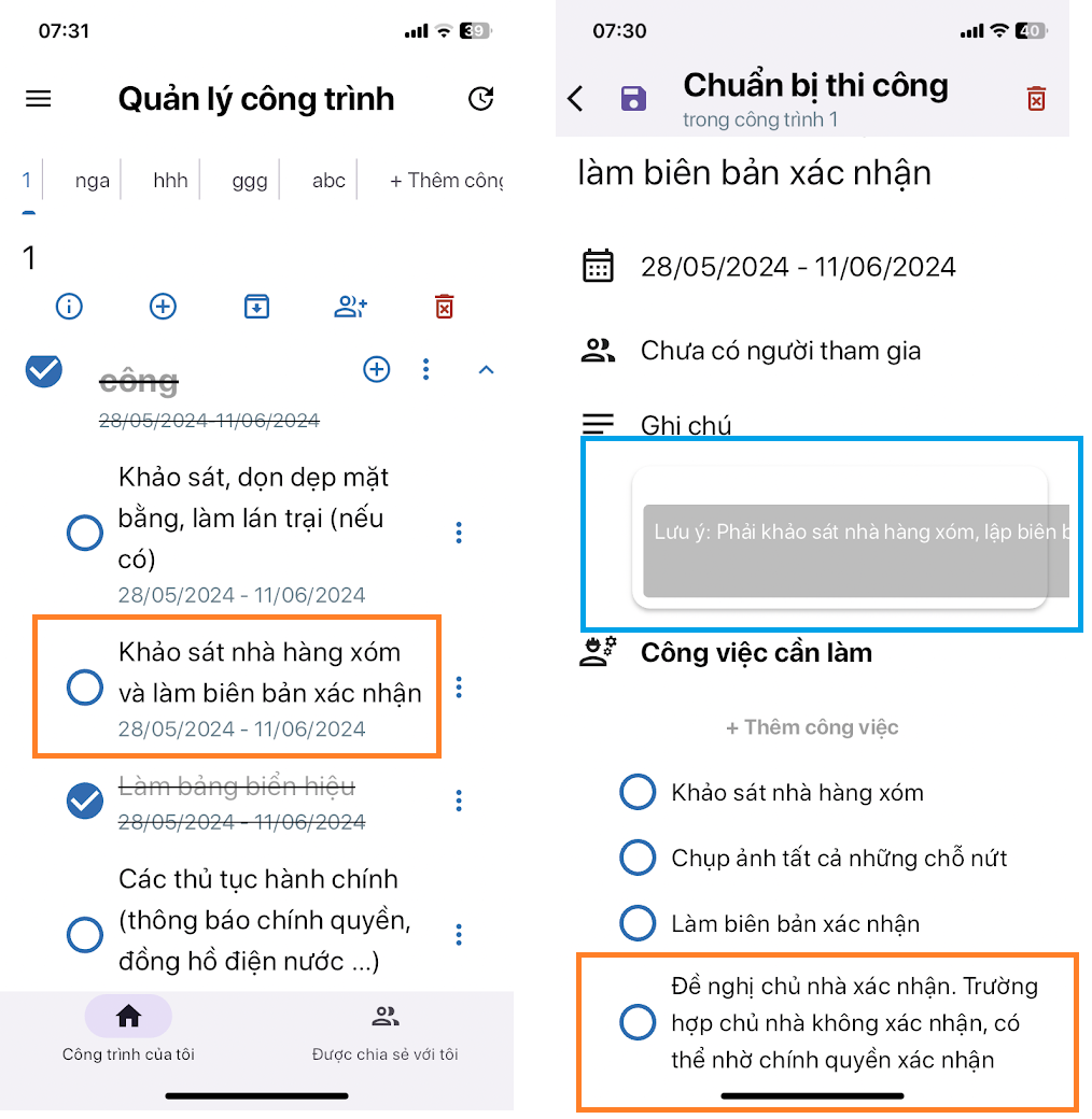 Trong danh sách công việc có sẵn việc khảo sát nhà hàng xóm, giúp bạn luôn nhớ để thực hiện. Khi nào thấy việc đó đánh dấu thì mới yên tâm.