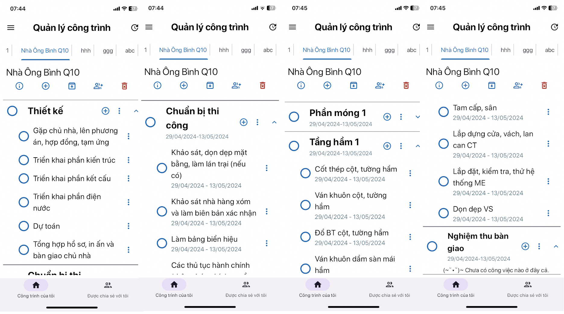 Khi bạn tạo mới một công trình, MyProject sẽ tạo cho bạn một công trình theo mẫu có sẵn, đầy đủ các hạng mục. Từ khi làm việc với chủ nhà cho đến khi hoàn thành bàn giao với các công việc thông dụng. Có các công việc con (checklist) để bạn có thể kiểm soát khi triển khai thi công, tránh sai sót.