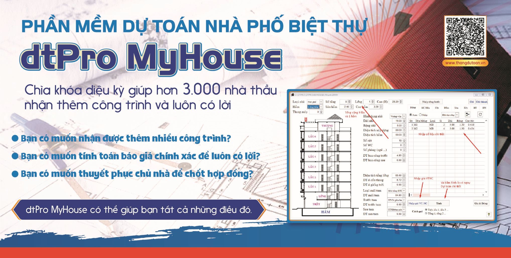 Phần mềm dự toán Nhà phố Biệt thự dtPro MyHouse đã giúp hơn 3.000 anh em Nhà Thầu báo giá nhanh, nhận được công trình và thi công có lời.