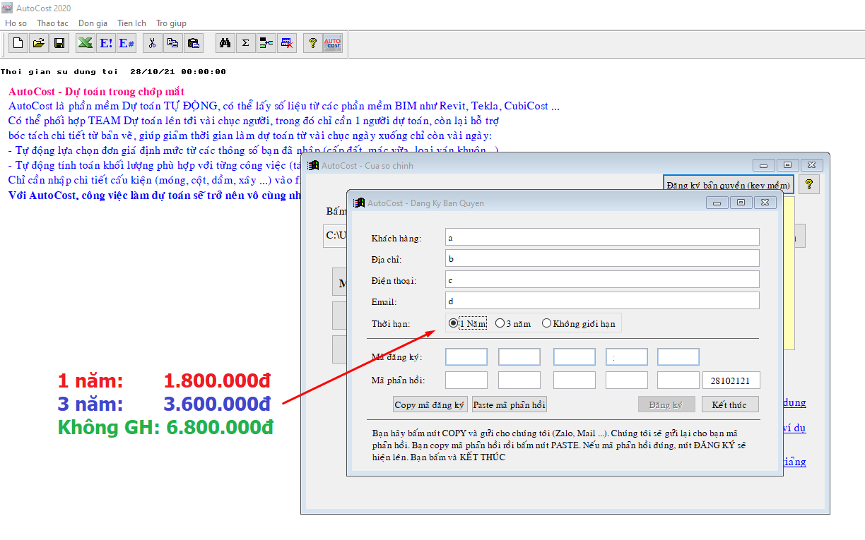 Phần mềm dự toán tự động AutoCost bản quyền 1 năm chỉ 1.800.000đ