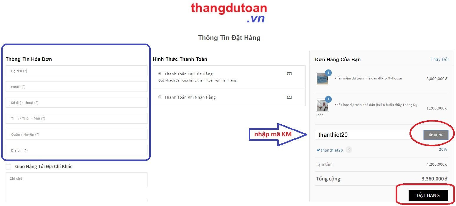 - Giảm giá 20% cho khách hàng đã sử dụng bất kỳ sản phẩm hay dịch vụ nào của dutoan.com và thangdutoan.vn từ 1/1/2017 trở lại đây. Nhập mã giảm giá thanthiet20