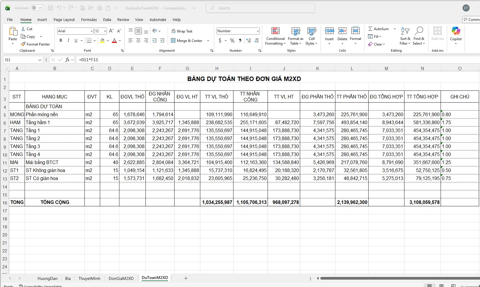 Điểm hay là bản này tính real time, tức là bạn nhập số liệu ở bên trái thì bên phải CÓ NGAY DỰ TOÁN.