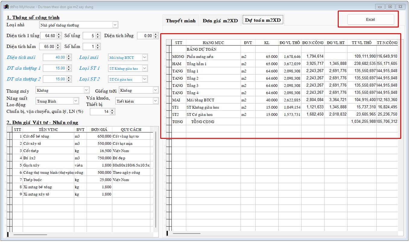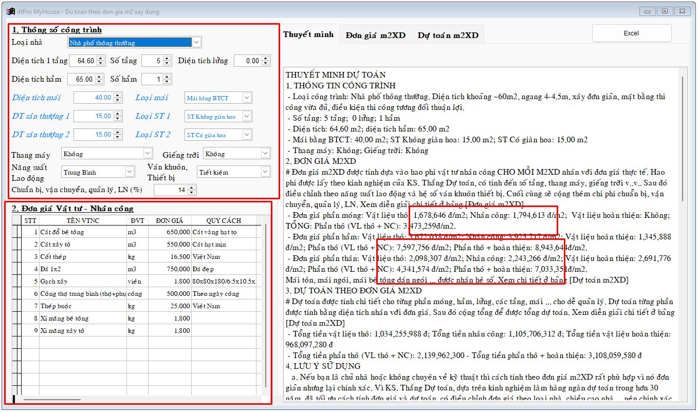 Như vậy, bạn có thể nhập để điều chỉnh số liệu công trình và biết ngay dự toán trong tích tắc. Rất phù hợp lên phương án xây dựng hoặc ngồi cạnh chủ nhà vừa tư vấn vừa nhập số liệu và có ngay kết quả.