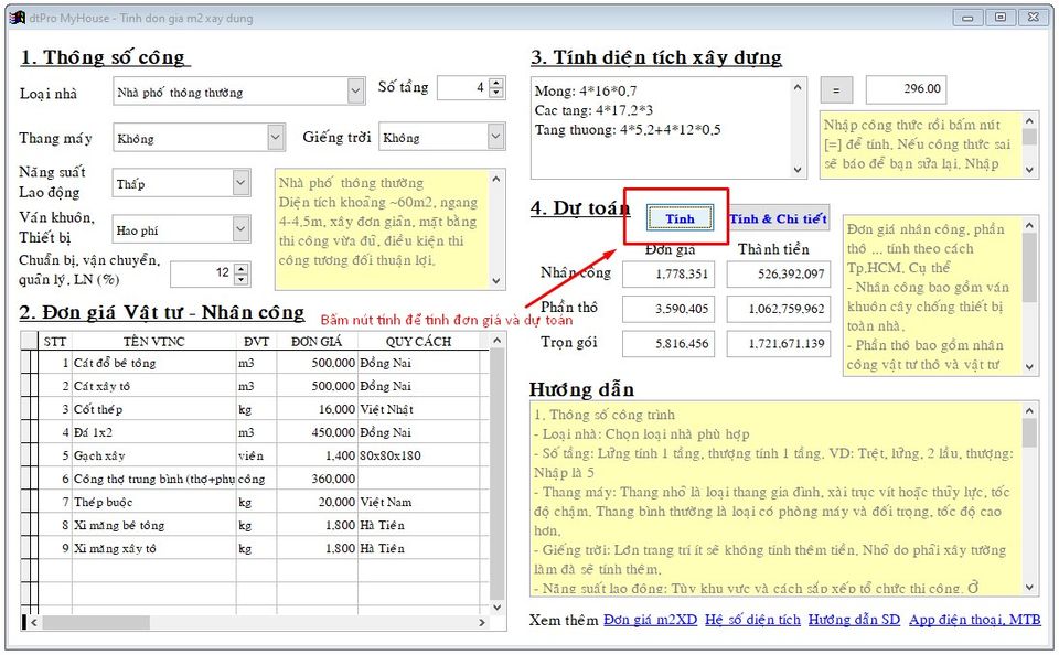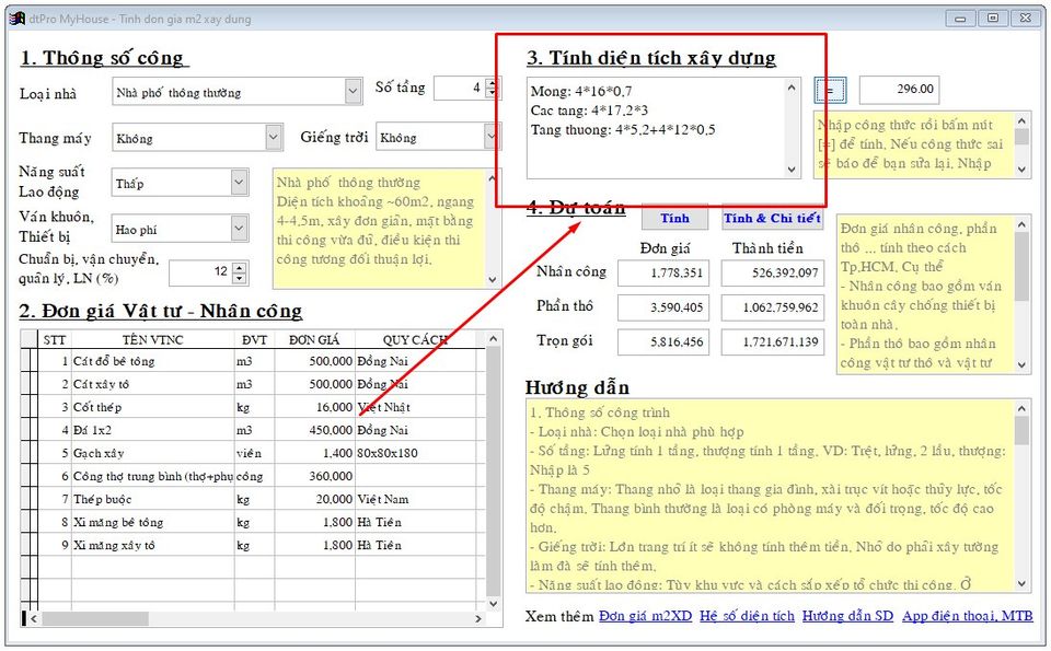 Giới thiệu sơ cho anh em nào chưa biết: PM dtPro MyHouse ngoài phần tính dự toán chi tiết thì còn có phần tính theo m2XD để anh em có thể tính nhanh theo kiểu m2 nhưng cập nhật được giá vật tư nhân công và các loại nhà ...
