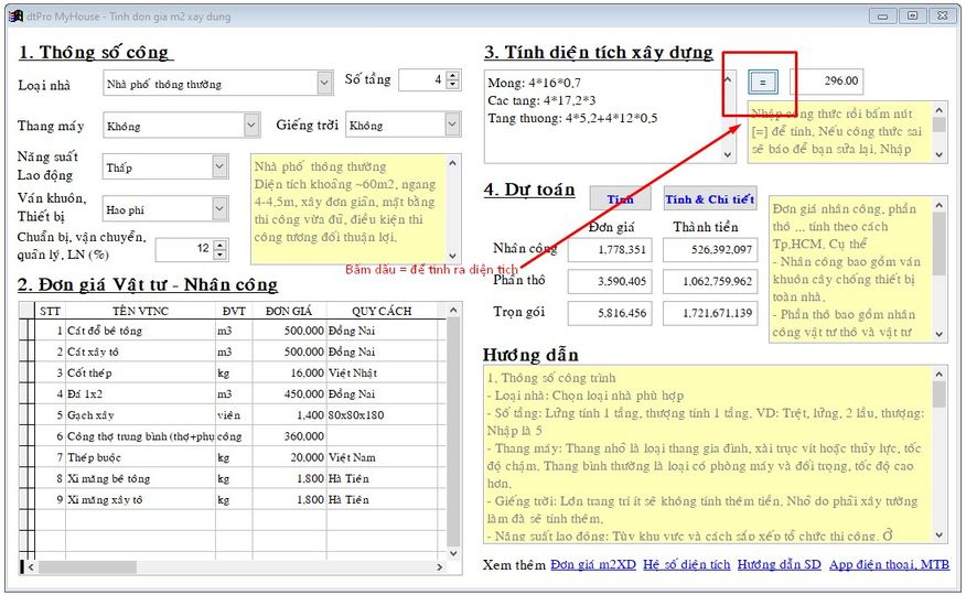 Nhập diện tích trong phần tính dự toán theo m2XD của dtPro MyHouse thế nào?