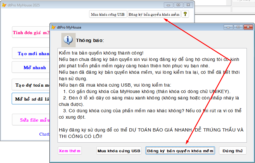 Bạn hãy bấm [Đăng ký bản quyền khóa mềm] và làm theo hướng dẫn để LẤY MÃ ĐĂNG KÝ máy của bạn gửi cho chúng tôi (bước 2). Sau khi thanh toán và xác nhận, chúng tôi sẽ gửi lại bạn mã bản quyền để bạn hoàn tất đăng ký.